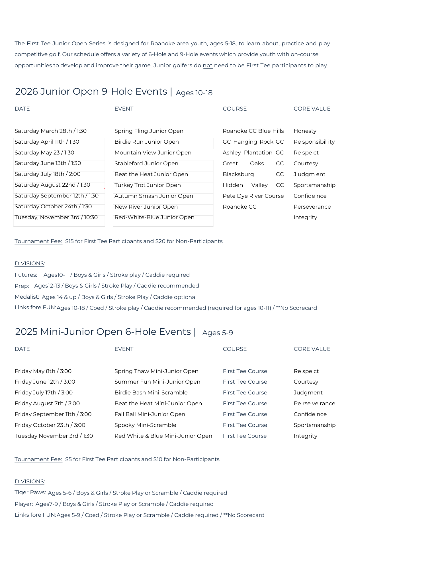 Active First Tee participants qualify for this reduced tournament fee (available to those who have participated in a class or are registered for one this year). As an added benefit, First Tee – Roanoke Valley participants will automatically be enrolled in the Youth On Course program at no additional charge when they play their first yearly Junior Open Series Event/Mini-Open Series Event.